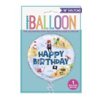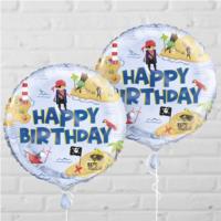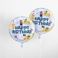 Round foil balloon with colourful pirate design and 'Happy Birthday' wording