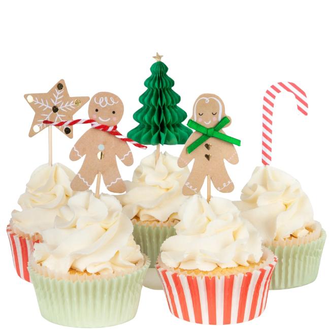 24 Toppers in 5 designs - 5 x gingerbread men, 5 x gingerbread women, 5 x candy canes, 5 x gingerbread stars and 4 x Christmas trees