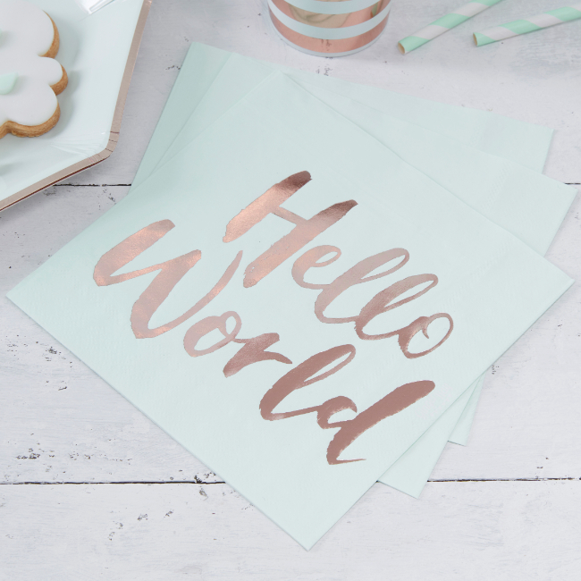 These lovely mint green Hello World Paper Napkins are perfect for all Baby Showers.