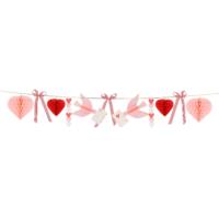Love is in the air! Hang this romantic Parisian garland to make any space special. Perfect for your porch, doorway, wall, or above your party table, its modern mix of pink and red, along with gingham ribbons and 3D hearts, adds a memorable touch. It works equally well as a Valentine's party banner or a bridal shower decoration. Pack it away after use and bring it out each year to keep the love alive.