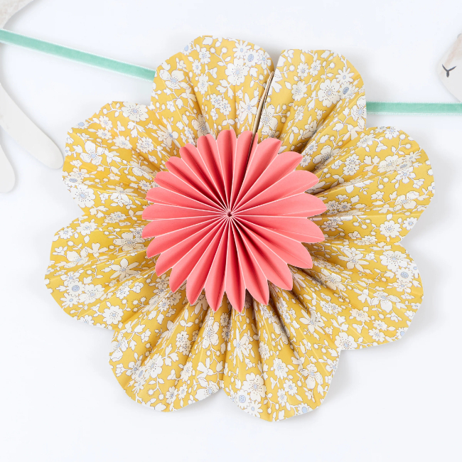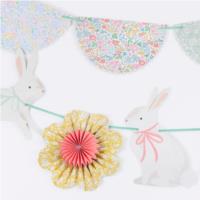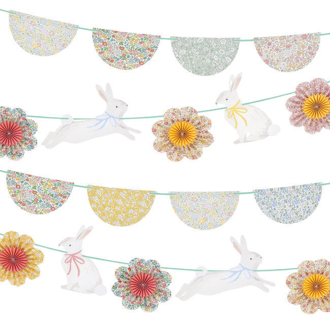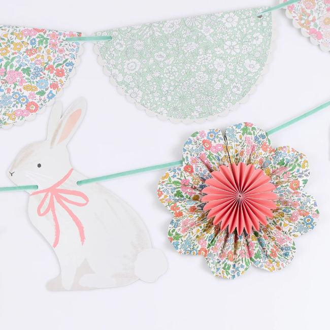 Garland two features 5 paper flower pinwheels, in Liberty floral designs with shiny gold foil edges, and 4 bunny pennants with different coloured bow details