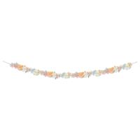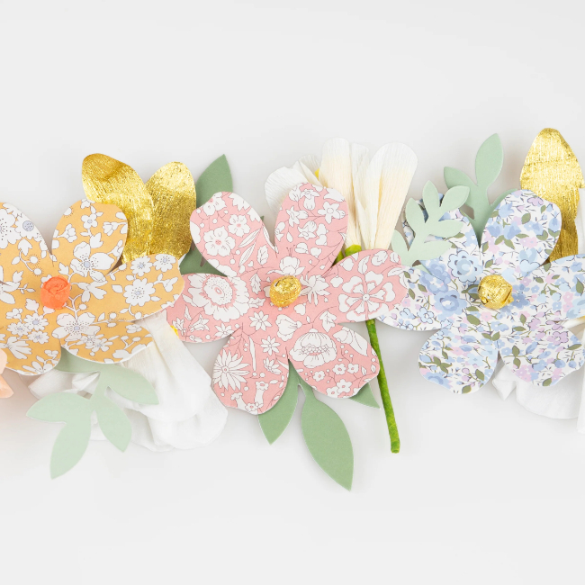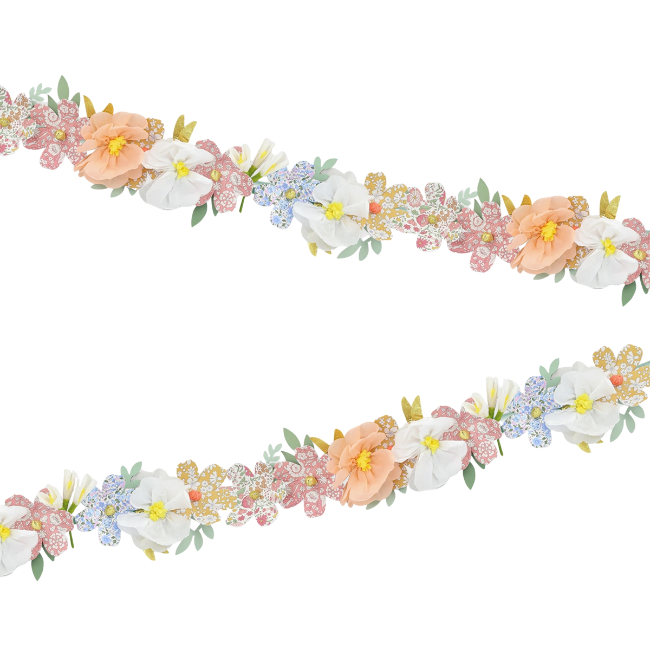 The garland consists of 16 crepe paper flowers; 24 3D paper flowers with Liberty print designs on both sides, paper leaves and crepe ball middles; 12 metallic gold leaves and 20 single leaf pennants