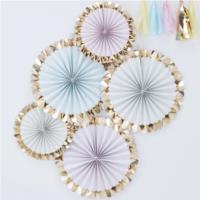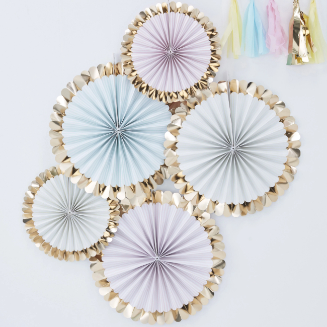 Each pack contains 5 fans - 3x large and 2x small. Large - 1x mint green, 1x yellow, 1x pink. Small - 1x pink, 1x yellow. Large fans measure: 38cm (D), Small fans measure: 28cm (D). Paper clips are included in the pack to secure fans in place and can be packed away to use again.
