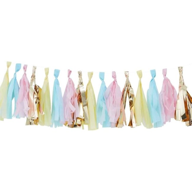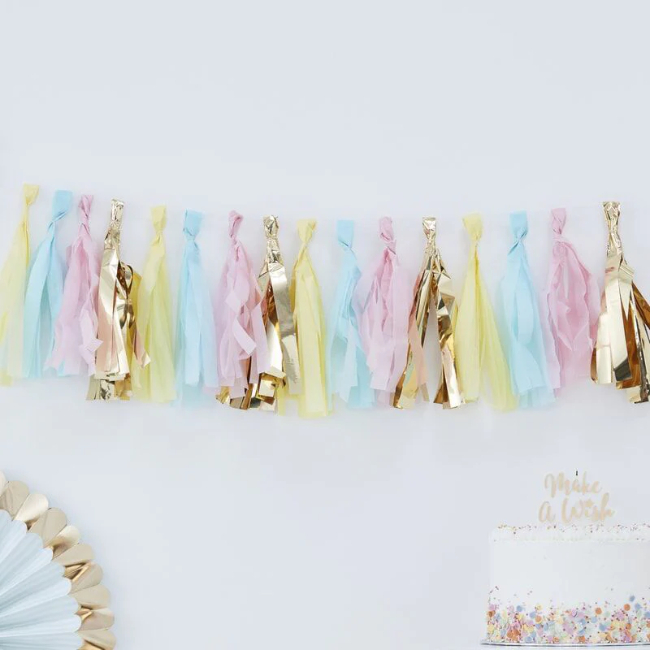 Garland Tassels Gold & Pastel Colors includes 16 tassels in gold, pink, blue, and yellow. Fold and attach the tassels yourself on the garland's string and create your own color pattern that suits your party. The pastel-colored tassels are made of thin paper, and the golden tassels are made of cardboard. Instructions for folding the tassels are included.