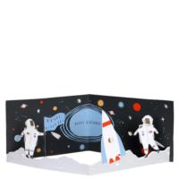 This card is perfect for would-be space adventurers. It features a fold-out lunar scene complete with space rocket and an astronaut planting a Happy Birthday flag. Bright and colourful with silver foil details. Comes with a coordinating envelope.