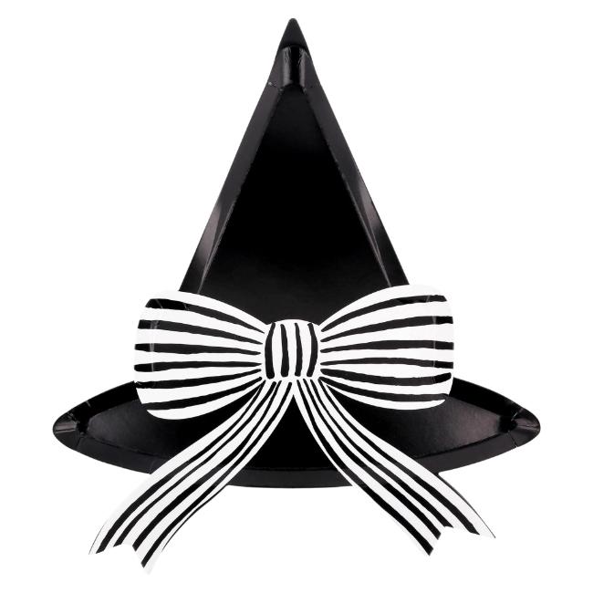 The witching hour is here again, so delight your little coven with an elegantly eerie Halloween party. These witch hat napkins, adorned with chic striped bows, add a spellbinding touch to your table. Their classic black-and-white design pairs beautifully with the rest of your Halloween tableware and decorations