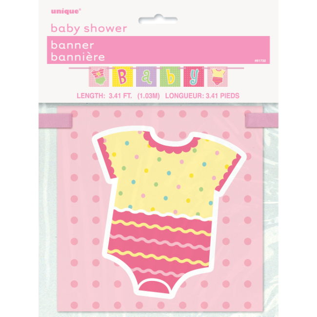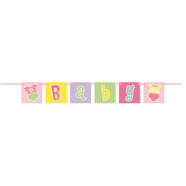 Featuring the word "Baby" with cute pink onesies on polka dot pennants, this party banner is ideal for a girl baby shower, gender reveal party or baby sprinkle. This square bunting banner can be hung easily in an archway or above your party table, or outside your party room to direct your guests to the right location.