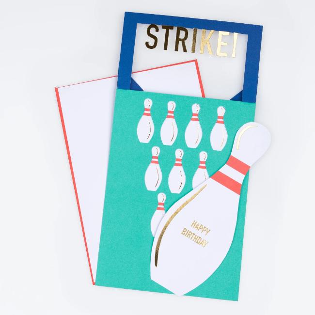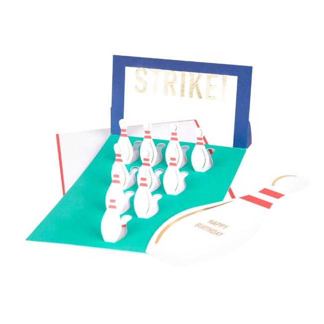 Strike! This is the perfect birthday card for someone who loves hitting the lanes. The receiver can simply lift up the paper bowling pins, and strike back board, for a fun 3D effect. Ideal to give to someone who is having a bowling party, or loves this sport.